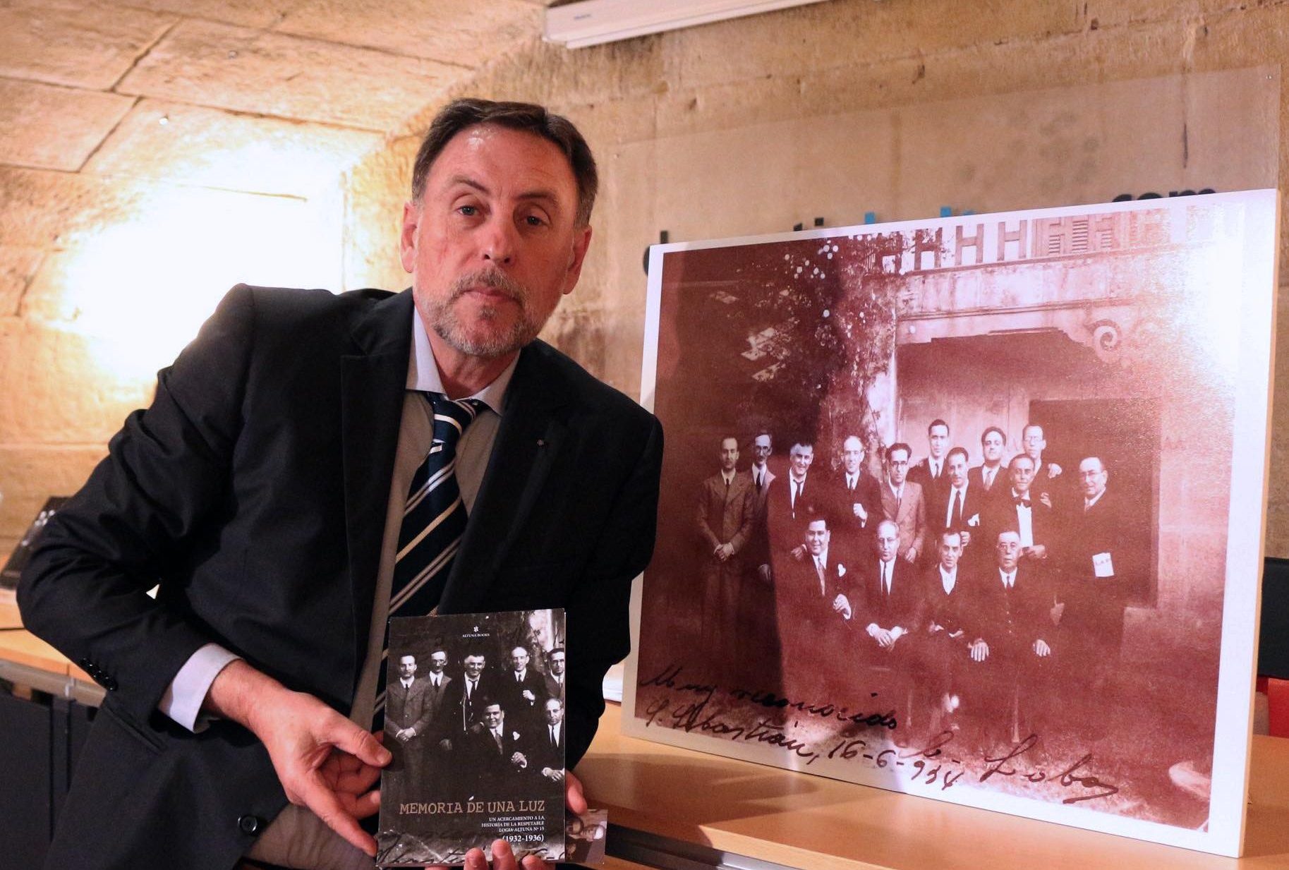 - El Sr. Iñaki Zuloaga, Presidente de la asociación Altunaberri, posando con el libro junto a la fotografía de los miembros de la antigua Logia Altuna Nº. 15 (1932-1936).