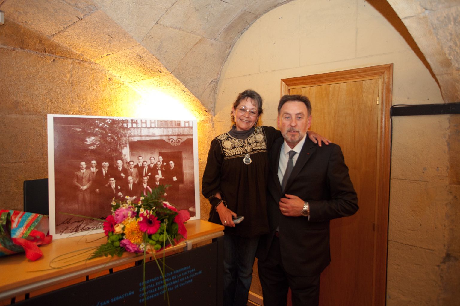 - El Sr. Iñaki Zuloaga junto a una nieta de Francisco Marco Chilet, uno de los miembros de la antigua Logia Altuna Nº. 15.
